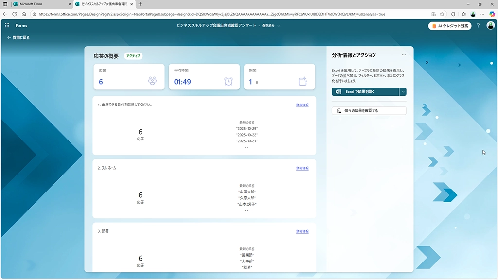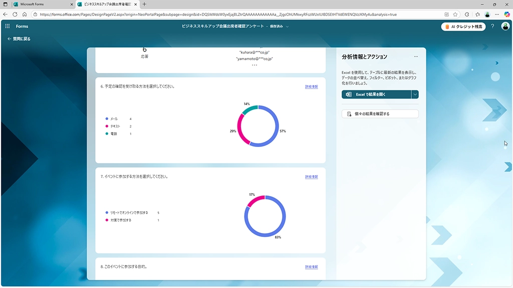 応答の表示で右に表示されている「Excelで結果を開く」をクリックすると、内容をExcelの表で表示・利用できる。普通のExcelのデータになるので、データを自分で分析してグラフにしたり、集計することも可能。お好みで利用するといい。ここまでを素早くできるのがいいところだ。