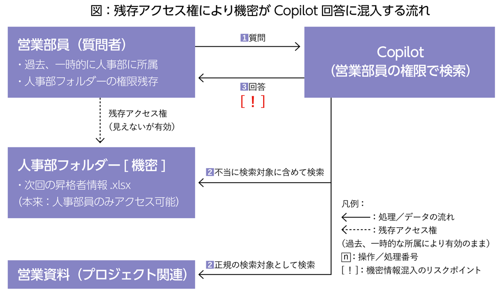 例えば、人事部が「次回の昇格者情報」を共有していたフォルダーに、過去一時的に人事部に所属していた営業部員のアクセス権が残っていたとする。その営業部員がCopilotに「プロジェクトの進捗」に関わる内容を尋ねた場合、「次回の昇格者情報」を回答に引用し、共有してしまうリスクがあるのだ(上図)。