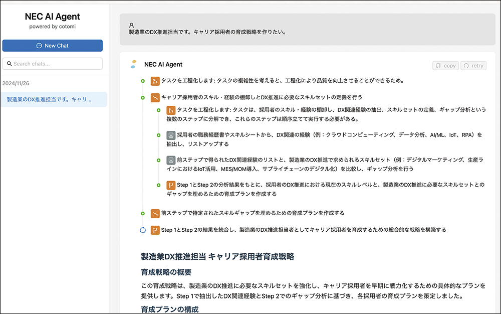 このcotomiのLLMを用いたAIエージェントとして提供をスタートしたのがNEC AI Agentだ。NECのAIエージェントはユーザーが依頼したい業務を入力すると、AIが自律的にタスクを分解して必要な業務プロセスを設計し、それぞれのタスクに最も適したAIやITサービスを選択して業務を自動的に実行してくれる。第一弾として、経営計画や人材管理、マーケティング戦略など、社内外の情報を包括的に検索し、意思決定が求められる業務のプロセスを自動化するNEC AI Agentを2025年1月から提供している。