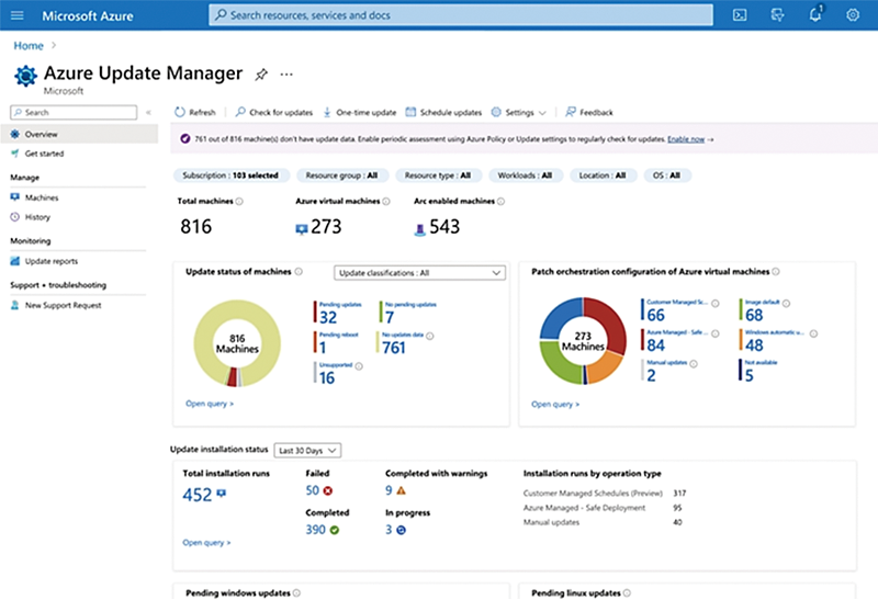単一の管理ウィンドウから、Azureおよびオンプレミス内、または (Azure Arcによって接続された) その他のクラウド環境内のマシン全体でWindowsやLinuxに準拠した更新を監視できます。