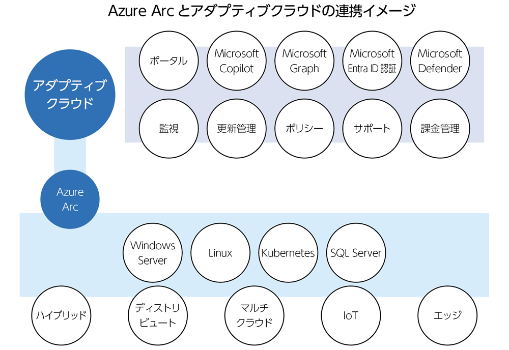 プラットフォームなどの選択肢はそのままにシステムの中心となる一点にAzure Arcを接続することで、複数拠点、分散システム、バラバラなチームのプロセスを統合し、お客さまのビジネスをサポートします。これにより、ハイブリッドクラウドから複数の環境を統合的に管理し、企業のITインフラを最適化する「アダプティブクラウド」へのアプローチを実現できます。