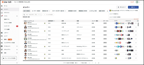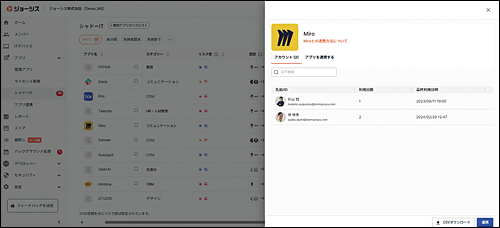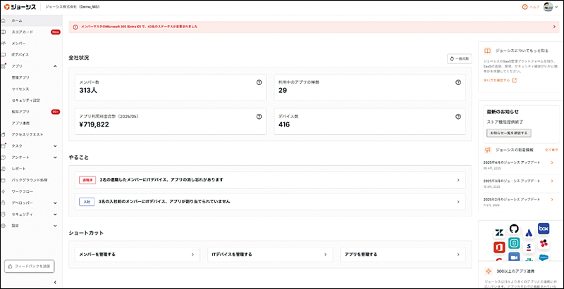 この「やること」が表示されるホーム画面は、Josysにログインした直後に現れる。ログインの習慣を身に付けるだけで、社内のライセンス最適化が自然と進んでいくのだ。加えて、ホーム画面にはメンバー数、利用アプリケーションの種類、利用金額の合計、所有デバイス数などのサマリー情報も表示されるため、管理者は自社のIT資産の全体像を把握しやすくなっている。