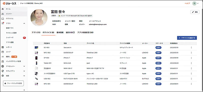 ITデバイスの管理においても、Josysは人を起点としたアプローチを採用している。そのため、ノートPCやタブレットなどのITデバイスはもちろん、モバイルバッテリーやセキュリティカードといった周辺資産も管理対象となっている。誰がどのデバイスを使用しているかを正確かつ最新の情報で把握でき、従業員の退職時には個人が保有していた会社の備品をスムーズに回収可能だろう。