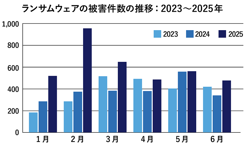 トピックの一つ目が、ランサムウェア被害の増加だ。2025年上半期の被害件数は、2023年、2024年の同時期と比較して約70%増加した。背景には、AIによるフィッシングメールの高度化や攻撃プロセスの自動化、中小企業などセキュリティ体制の脆弱な組織が狙われるようになったことが挙げられる。特に2月には脅威アクター「Clop」の活動が活発化し、キャンペーン的な攻撃が増加した。その結果、被害件数は前年同月の2倍以上となる955件に上った。一方で4〜6月にかけては、ランサムウェアをサービスとして提供する「Ransomware as a Service」の一部閉鎖や、脅威アクターの逮捕・再編などの影響により、攻撃件数はやや落ち着いた。