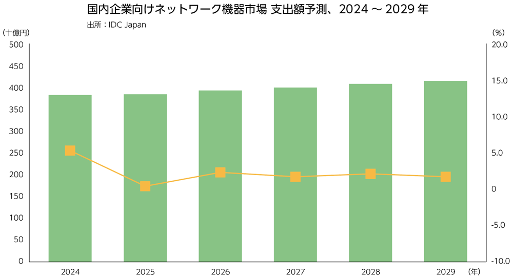IDC Japanの調査によると、データセンター向けイーサネットスイッチを含む企業向けイーサネットスイッチ市場の2024〜2029年の年平均成長率は2.4%、企業向け無線LAN機器市場の同年平均成長率は0.4%と予測している。一方で、企業向けルーター市場の同年平均成長率はマイナス1.3%の予測だ。同調査では、無線LAN、イーサネットスイッチ、ルーターを対象として分類している。IDC Japan Infrastructure&Devicesのシニアリサーチディレクターの草野賢一氏はネットワーク機器の市場の変遷を次のように語る。「ここ10年ほどの企業向けのネットワーク機器市場の傾向としては、無線LANが企業のネットワークアクセスの主流になったと認識しています。その後新型コロナウイルス感染症拡大を経て、多くのデスクトップPCがノートPCにリプレースされ、同時期にフリーアドレスの浸透などオフィスの働き方が変化する中で無線LANはより導入が促進されました。こうした変遷の中で、無線LANが新たな使い方や需要を掘り起こす形で成長のドライバーとなり、近年の企業向けのネットワーク機器市場は比較的活発化した結果となりました」