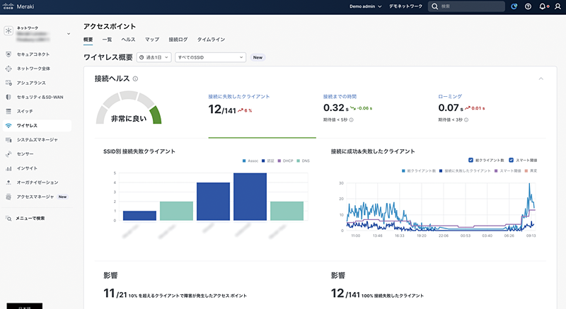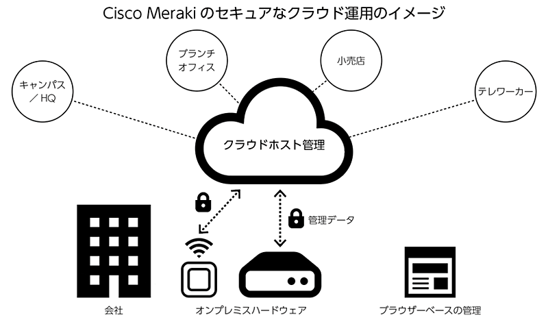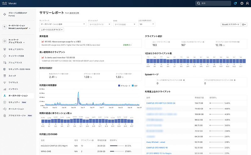 Cisco Merakiのネットワークおよび各製品は、クラウド管理プラットフォームである「Cisco Merakiダッシュボード」からの一元管理に対応する。豊富な機能を備えながらもシンプルかつ直感的で使いやすい日本語対応ダッシュボードとなっている。本ダッシュボードにより、運用コストを削減しつつさまざまなITインフラ課題の迅速な解決をサポートする。管理に当たって、管理用ハードウェアやソフトウェアのインストールは不要だ。Webブラウザーからアクセスできる管理画面をクラウドサービスとして提供しているため、インターネットに接続できる環境さえあれば、どこからでも設定・監視が可能だ。また、豊富な機能を備えながらもCLIやターミナルなど、コマンド入力が不要で分かりやすい日本語に対応したGUIで操作ができ、直感的に使える管理ツールとなっている。