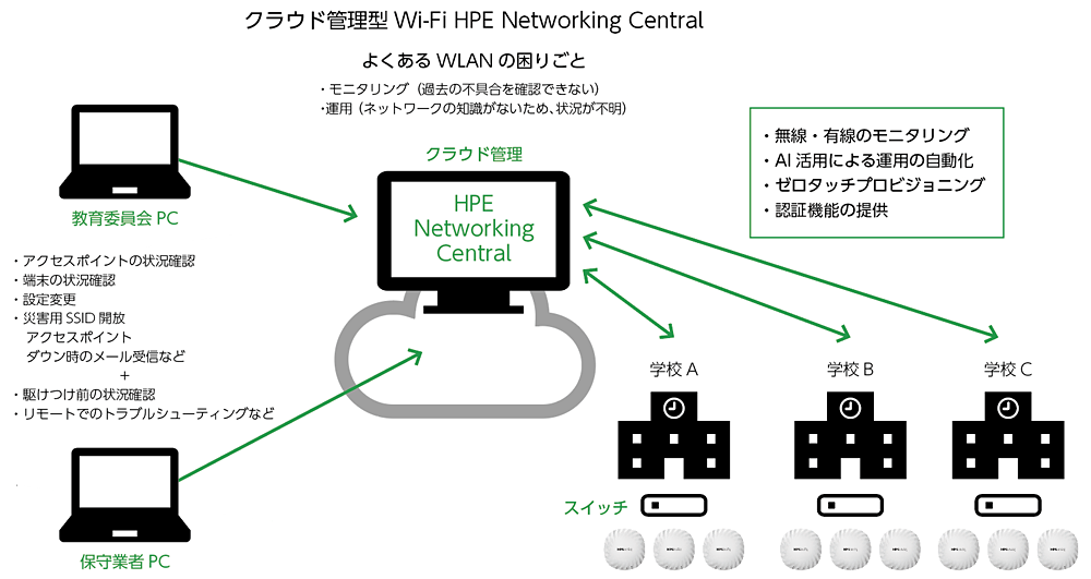 「HPE Aruba Networking SSE」というセキュリティ機能も提供している。例えば、明確なアクセスコントロールポリシーに基づきプライベートリソースへのアクセスを提供するゼロトラスト機能「Zero Trust Network Access」に対応している。全てのWebトラフィックを監視・検査し、マルウェアからの保護やURLフィルタリングを実現する「Secure Web Gateway」も利用可能だ。具体的には、高度なSSL検査、URLフィルタリング、マルウェアスキャン、脅威インテリジェンス保護などに対応する。さらに「Cloud Access Security Broker」はSaaSアプリケーションへのユーザーアクセスの管理・制御、監視するためのクラウドベースのセキュリティを提供する。また、ユーザーエクスペリエンスをエンド・ツー・エンドで可視化し生産性向上を支援する「Digital Experience Monitoring」も搭載している。デバイス、アプリケーション、ネットワークのパフォーマンスをきめ細かに監視するため、組織内のIT管理者は接続に関する問題を簡単に特定して解決できる。こうしたセキュリティ機能で保護しておけば、インターネットやデータセンター、パブリッククラウドやSaaSなどさまざまな外部プラットフォームとの接続も安全に行える。学校での支給端末やBYODといったデバイスからプライベート環境、SaaS、インターネットなどへのセキュアなアクセスを実現する。