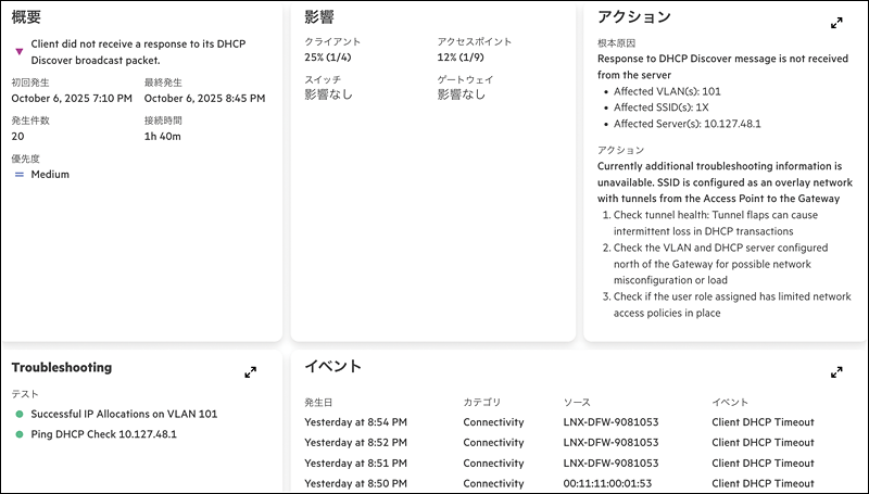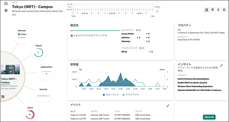 HPE Aruba Networking AP-725の利用に際しては、機器本体のほかにクラウド管理ソリューション「HPE Networking Central」が必須となる。本ソリューションは柔軟な展開を実現するダッシュボードで、効率的なITオペレーションを促進する。拠点ごとの一元管理や認証機能も搭載しているのだ。最適なファームウェアの推奨や省電力モードなどのAIオペレーションも実現する。サードパーティーのデバイスのクラウド管理にも対応する。「過去の不具合を確認できない」「ネットワーク知識がなく状況が不明」といったモニタリングや運用の問題に対して、無線・有線のモニタリング 、AI活用による運用の自動化、ゼロタッチプロビジョニング、認証機能といった機能を提供して解決を図れる。