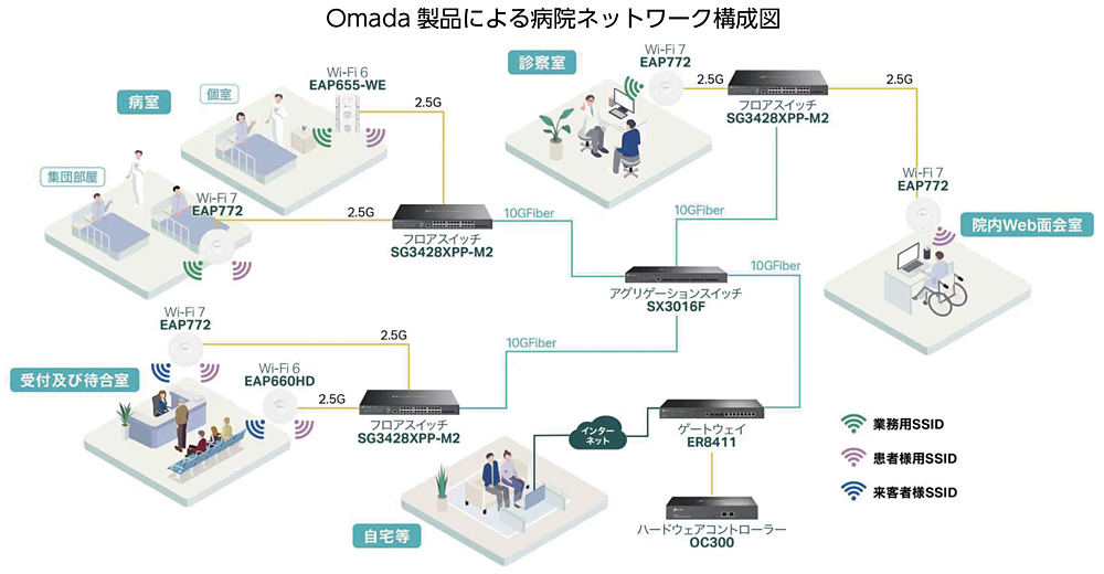 また近年では、病院内において業務用ネットワークに加え、患者向けのインターネット提供も標準的なサービスとなりつつある。しかし、これまで多くの医療機関では、医療機器への影響が懸念され、ネットワーク導入を見送るケースも少なくなかった。こうした課題も、Omadaの各製品を導入することで解決が進んでいる。「EAP660HD」や「EAP655-WE」をはじめとするアクセスポイントは、医療機器用ネットワークや電子カルテ用ネットワークに加え、患者用Wi-Fiの干渉を回避しながら高速ネットワークを構築できる「カスタムチャンネル範囲」機能を備えており、医療機器への影響を抑えられるのだ。こうした機能が評価され、病院・医療施設では、累計1万6,000台以上のOmada製品が導入されている。