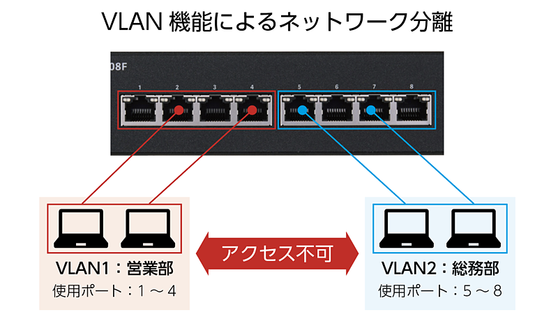 EHB-SX2B08Fは、高度なセキュリティ機能も多数搭載している。ポート単位で、ネットワークアクセス制御のための認証規格「IEEE 802.1X認証」に対応し、ユーザーやデバイスのアクセス制御を強化している。RADIUSサーバーとの連携により、不正接続を未然に防ぎ、ネットワーク全体のセキュリティレベルを高められる。加えて、複数のネットワークを構築できるVLAN機能を搭載。部門・フロアごとのネットワーク分離や、マンション・ホテルなどでの端末間通信防止を実現できる。社内環境に応じた柔軟かつセキュアなネットワーク環境を構築可能だ。