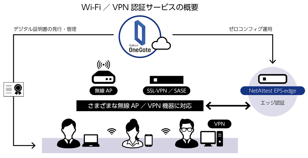 Soliton OneGateは、各種メーカーの無線アクセスポイント・VPNゲートウェイ製品と連携実績がある。運用を助ける豊富な機能を搭載し、その一つが「Wi-Fi/VPN認証サービス」だ。