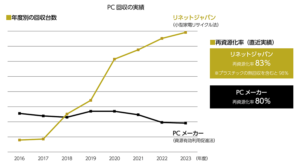 リネットジャパングループは、2000年にリユースを軸に創業し、現在はリサイクル、障害福祉、海外HRへと事業を広げている。その中核を担うリネットジャパンリサイクルは、「小型家電リサイクル法」に基づく認定事業者として全国750以上の自治体と連携し、PCや小型家電の回収・再資源化を推進してきた。IT資産の適正処理においても、データ消去からリユース・リサイクルまで一貫した体制を構築し、企業や自治体に安心を提供している。