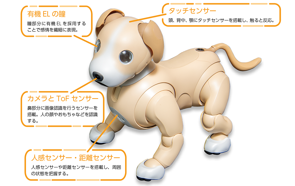 aiboに使用されているパーツは4,000点以上。これらを極力継ぎ目やネジなどが見えないように設計することで、現在のaiboの柔らかく、愛らしいフォルムを実現している。そしてそのボディには、さまざまな場所に多様なセンサーを搭載することで、周囲の状況を把握して次の行動にフィードバックすることを可能にしている。頭や背中、顎の部分にはタッチセンサーが搭載され、人が触れたりなでたりする行為に対して鳴き声を上げたり尻尾をふったりするようなフィードバックを返す。また鼻先には画像認識が行えるカメラが内蔵されているほか、ひげの部分にToFセンサーが搭載されており、これによってカメラ映像と組み合わせて二次元の距離を計測している。尻尾の付け根部分にはSLAMカメラを搭載し、屋内の特徴を認識することで、aibo自身の行動範囲や現在位置を把握している。