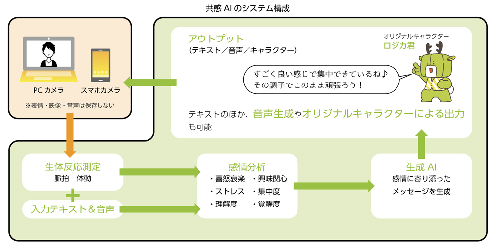 このような教育現場が抱える課題を解決するため、ロジカ・エデュケーションが開発したのが共感AIだ。本技術はPCやスマホのカメラで人の顔を読み込むと、そこから心拍などの生体反応情報を推定して取得する。その生体情報を基に感情分析を行い、生成AIが利用者の感情に寄り添ったメッセージを出すというものだ。