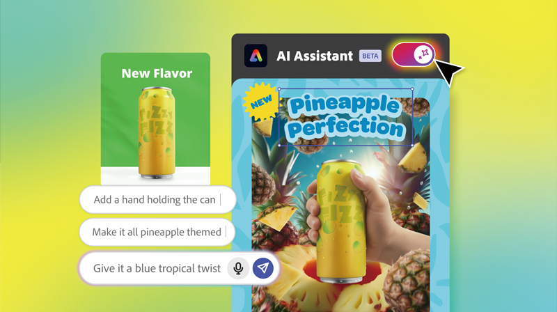 2025年10月28日(現地時間)、米国のアドビ主催で開催された世界最大級のクリエイティブカンファレンス「Adobe MAX」では同社製品のさまざまなアップデート、新機能が発表された。その中でもExpressには新たに「AIアシスタント」機能(ベータ)の導入が発表された。本AIアシスタント機能は、ユーザーが作りたい内容を言葉で説明するだけで、目的のコンテンツをデザインできる対話型AIとして提供される。プロモーションしたい製品に合わせてデザインモチーフを統一させたり、人の手を追加させたりといった画像加工、デザイン編集を全て自然言語で行えるようになる。制作した静止画を動画に変換するような指示にも対応してくれる。このAIアシスタント機能はユーザー側でオン・オフを切り替えられるため、ユーザー自身が手を加えたい場合は従来通り、手動での編集が行える。細かく作り込みたい箇所は手動で編集するなど、AIアシスタント機能との共同作業も行えるのだ。これらのAIアシスタント機能は、まずAdobe Express プレミアムプランのユーザーに提供され、その後全てのAdobe Expressユーザーに一般提供がスタートする。当初はデスクトップ版かつ英語版のみの提供だが、近日日本語版のリリースも予定しているという。