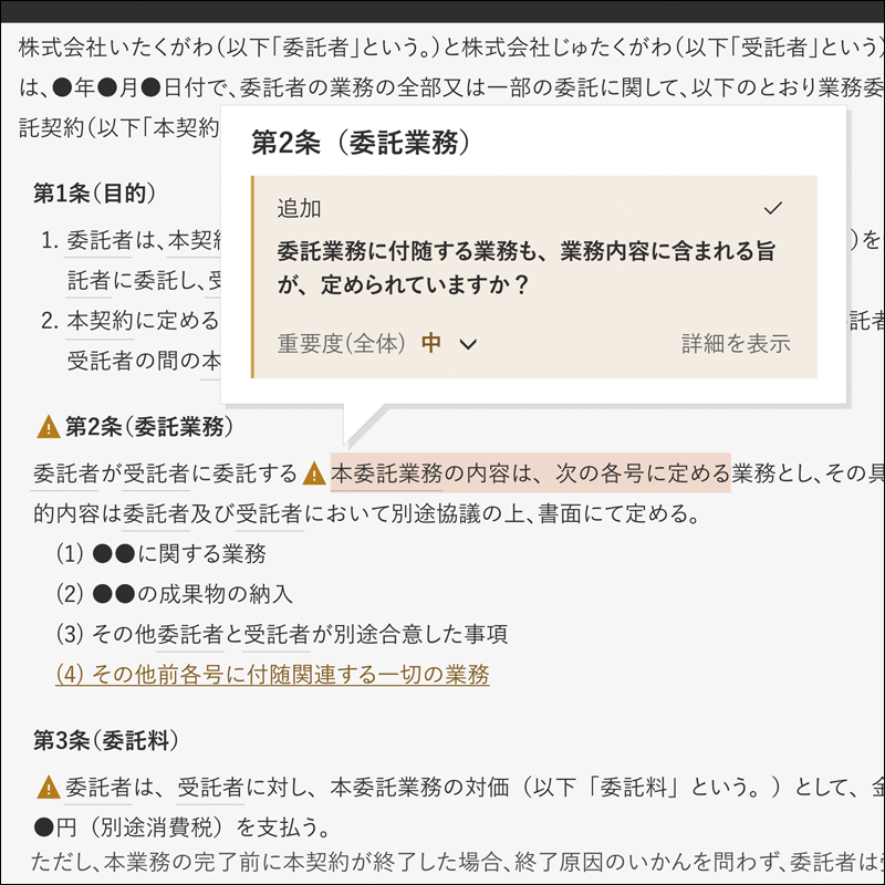それでは、LegalOnの機能を詳しく見ていこう。多数の特長的な機能の中から、本記事では二つ紹介する。まず一つ目は、AIが契約書のリスクや抜け漏れを的確に指摘する「レビュー」機能だ。契約書に潜むリスクを洗い出し、チェック項目や修正案を提示する「契約リスクチェック」や、特定の条件下で適用される法律や省令・規則、条例などのチェックが行える「法令遵守チェック」といった弁護士監修のチェック項目で、網羅的な審査を支援する。各チェックでリスクや見落としがある箇所を表示する「LegalOnアラート」機能も搭載し、ミスのない契約書の作成を徹底的にサポートする。