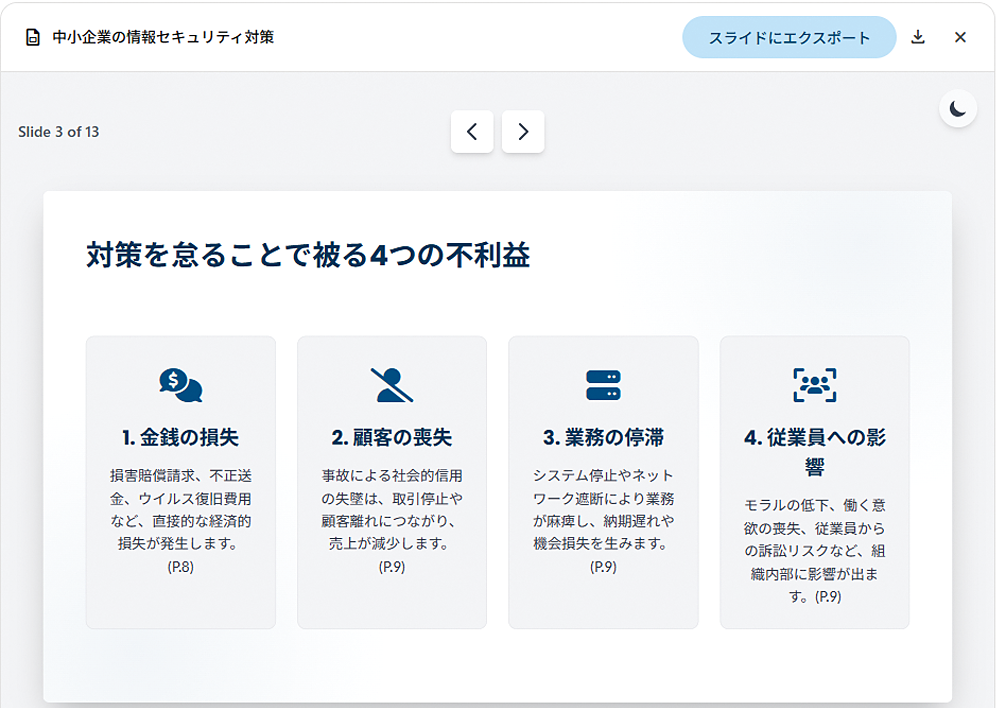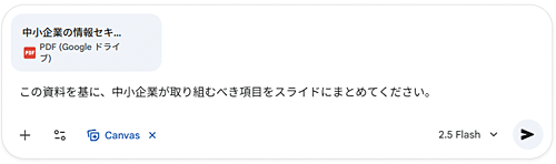 今回のアップデートで、 Gemini はこの課題を解決しました。Canvas 上に配置されたテキストや画像といった要素の関連性をAIが理解し、それらを論理的な流れを持つ「Google スライド」などのプレゼンテーション資料の構成案として自動で生成できるようになったのです。ユーザーは、Canvas 上で自由にアイデアを拡散させた後、「この内容でプレゼン資料を作成して」と指示するだけで、Gemini が各スライドのタイトル、箇条書き、さらには関連する画像の提案まで行います。
