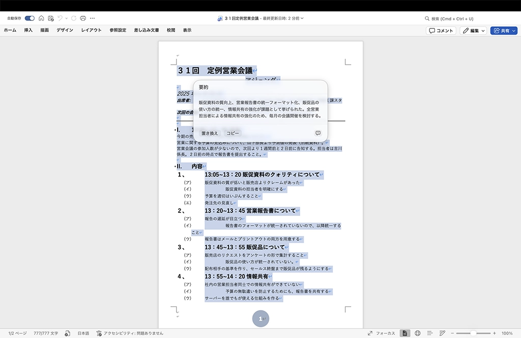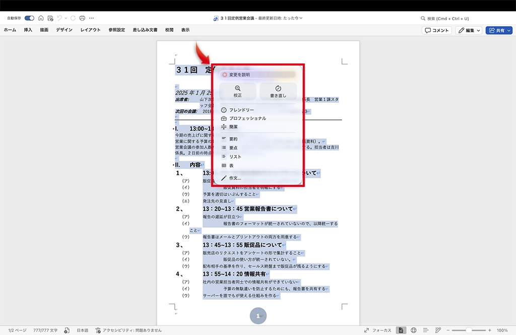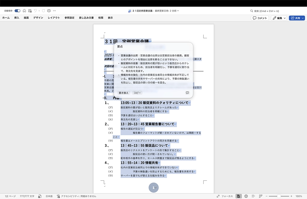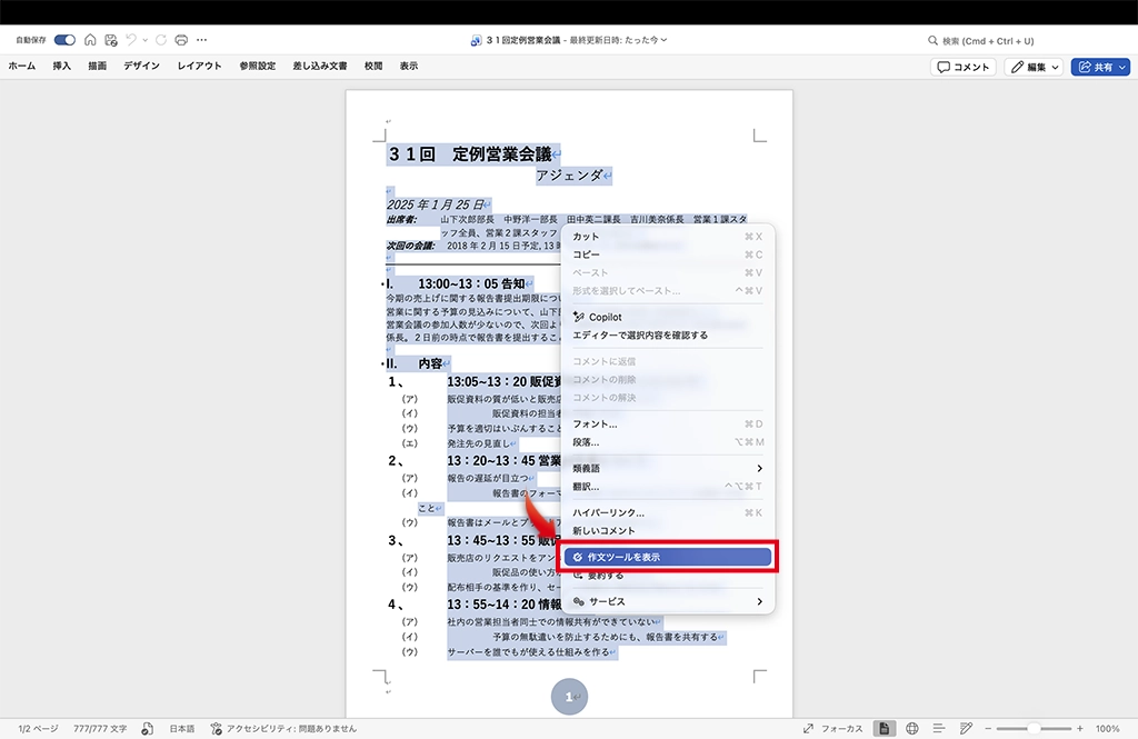 WordのテキストをApple Intelligenceで要約していこう。こちらも簡単で、まずテキストを選択して、右クリックメニューから「作文ツールを表示」を選択すると利用可能だ。内容は、iPhoneと同様に要約、要点、リストなどが選択できる。