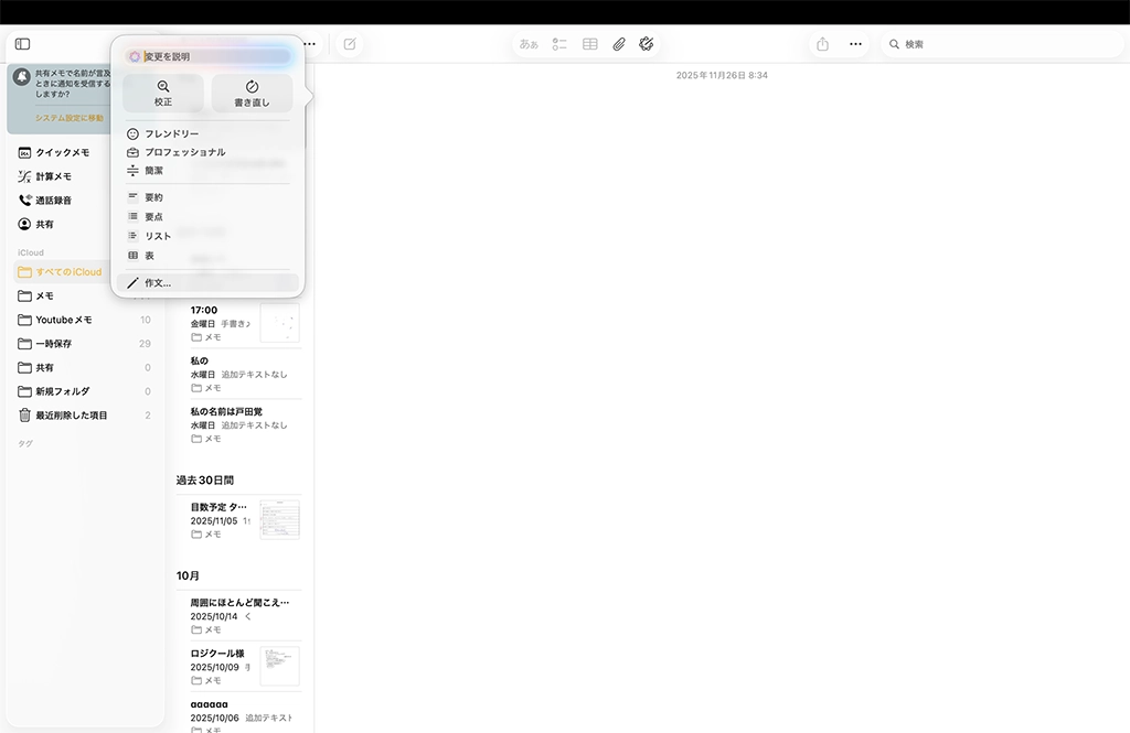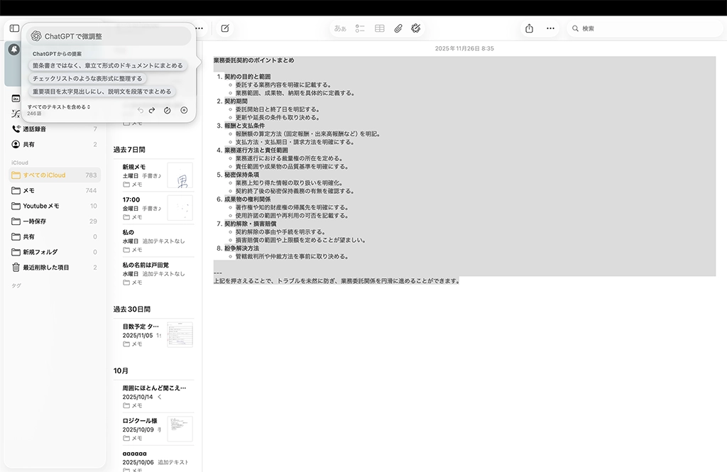 Apple Intelligenceの作文機能は、残念ながら現時点ではWordでは利用できない。メモなどの標準アプリで利用することができるので、必要ならこちらで作文し、テキストをWordに貼り付ければいいだろう。ただし、WordでCopilotが使えるなら、そちらで作成した方が手っ取り早い。業務効率のアップには、AIの利用がマストの時代なので、色々なツールを比較しつつぜひ使いこなしてほしい。