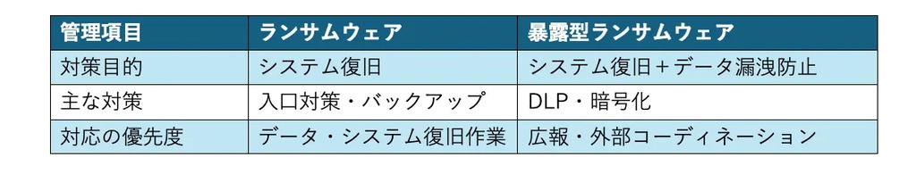 以下に従来型のランサムウェアと暴露型ランサムウェアの対策・対応の違いをまとめた表を示すので参考にしてほしい。