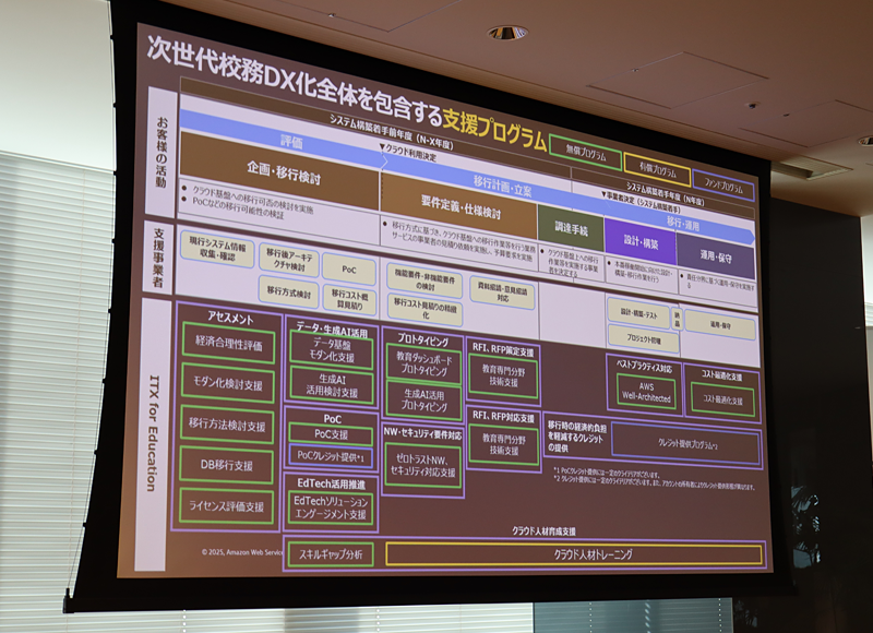 アセスメントによって課題を可視化した後は、その課題解決の方向性を見いだすことが重要になる。AWSジャパンのITX for Educationではアセスメント以降のクラウドへの移行計画・立案や移行・運用に至るまでの包括的な支援プログラムも提供する。例えばセキュリティ要件への対応では「ゼロトラストネットワーク対応支援」によって、校務支援システムや各種SaaSの利用を安全に制御し、次世代の校務DX化を支援する。これらのプログラムは多くが無償で提供されるが、クラウド人材育成を支援する「クラウド人材トレーニング」なども提供される。