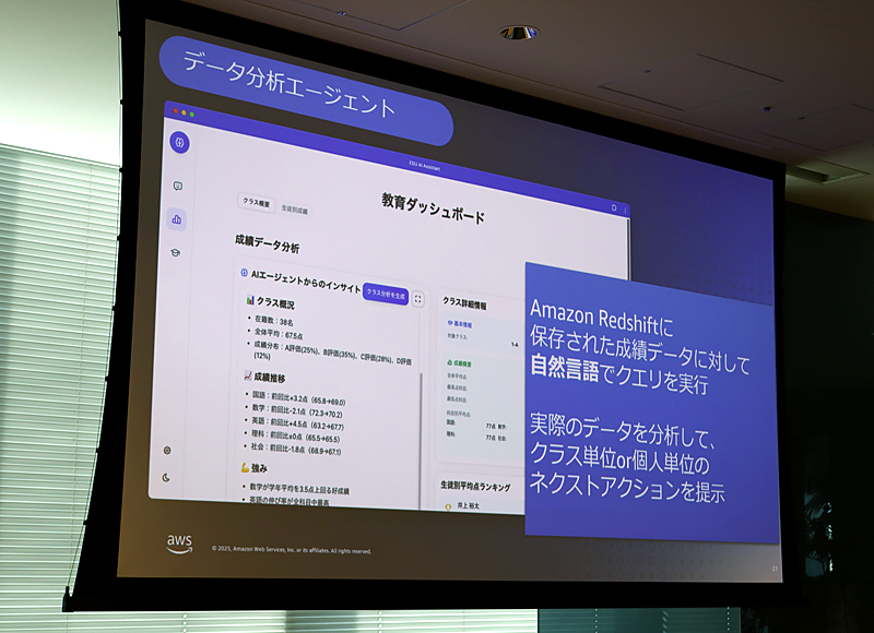 データ分析エージェントは、様々なシステムから集めたデータを自然言語で分析できるツールだ。「Amazon Redshift」に保存された成績データに対して自然言語でクエリを実行することで、実際のデータを分析し、クラス単位や個人単位でのネクストアクションを提示してくれる。