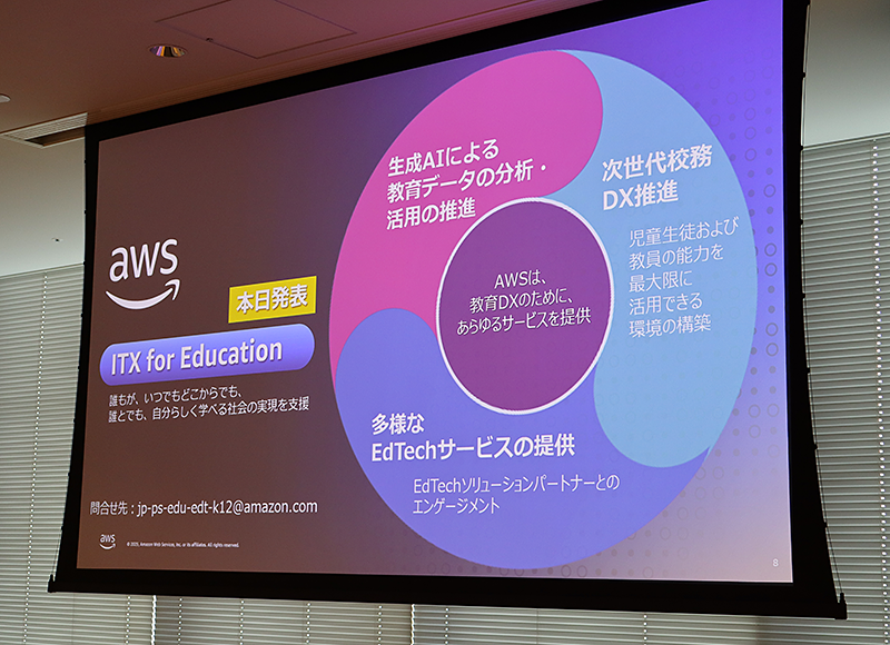 アマゾン ウェブ サービス ジャパンは2025年10月23日、教育DX推進支援に向けた包括的支援プログラム「AWS ITトランスフォーメーションパッケージ教育版」(ITX for Education)提供を開始した。当日の記者説明会では、同社の教育DXの取り組みと、ITX for Educationが提供する価値を解説すると同時に、名古屋市教育委員会と愛媛県教育委員会の活用事例が語られた。その内容を紹介していこう。