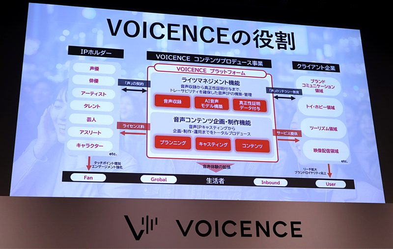 さらに花城氏は、VOICENCEが果たす役割についても解説する。VOICENCEでは声のコンテンツプロデュース事業を展開していき、その機能は大きく二つあるという。