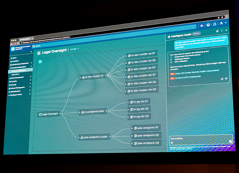 本イベントでは「VCF Intelligent Assist」という生成AI機能も披露された。システムのログやメトリクスをAIが分析し、トラブルシューティングを対話形式で支援するものだ。例えば「データベースのレスポンスが悪い」と入力すると、AIが関連するGPUの負荷状況などを即座に特定し、「vMotionでワークロードを移動すべき」といった具体的な解決策を提示して実行までサポートしてくれる。