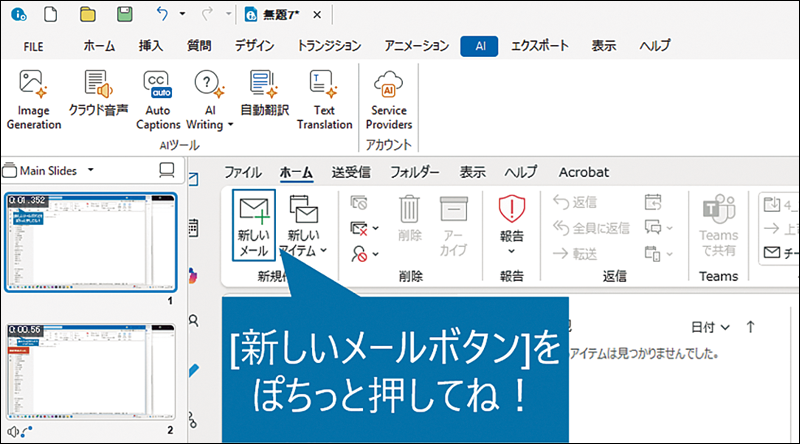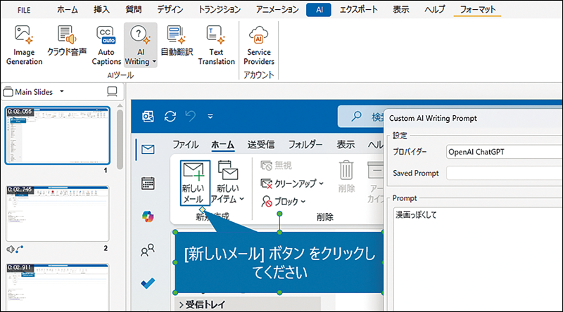 さらに「Custom Prompt」を使えば、任意の指示を入力することも可能だ。例えば「漫画っぽくして」とプロンプトを入力すると、「[新しいメールボタン]をクリックしてください」が「[新しいメールボタン]をぽちっと押してね!」のように、親しみやすい表現に変わった。