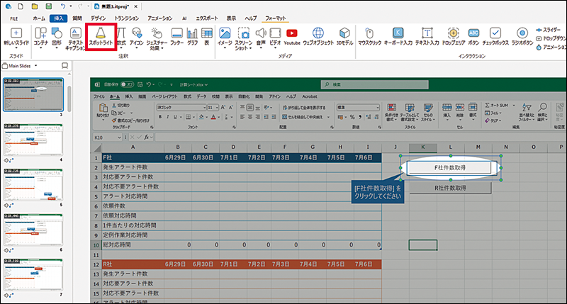 編集画面はPowerPointに似たインターフェースを採用しており、誰でも直感的に操作できる設計となっている。ツールバーは「ホーム」「挿入」「質問」などのタブで機能が整理されており、必要な機能にすぐアクセス可能だ。自動追加された吹き出しは位置やサイズの変更に加え、文章の編集にも対応している。操作の補足が必要な場合は、テキストキャプションや図形、表などを追加可能だ。またホームタブから、新しい操作をキャプチャーして新しいスライドとして挿入することもできる。中でも筆者が注目したのが「スポットライト」だ。これは、特定の箇所の周囲を暗くすることで視覚的にその部分を強調できる機能だ。似たようなボタンが並んでいる場合でも、どこに注目すべきかが一目で分かるようになる。