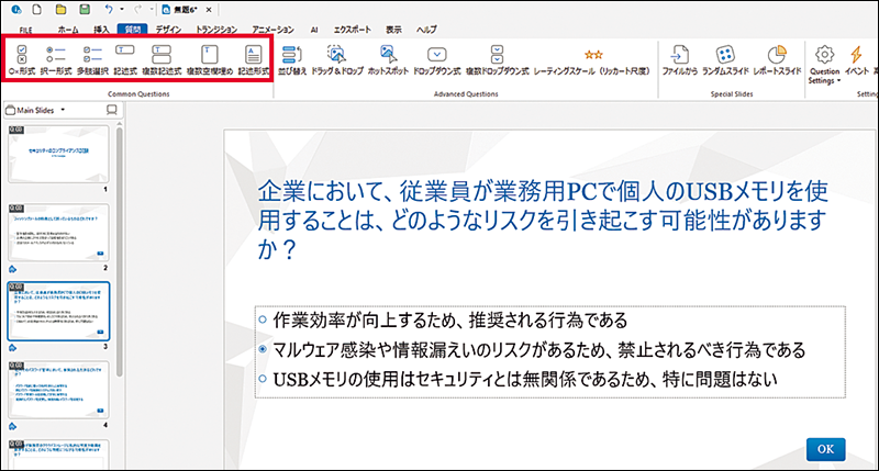 質問タブでは、○×形式や記述式などさまざまな形式のテストを作成できる。作成したテストに「レポートスライド」を挿入することで、テスト終了後に操作ごとの正誤判定や入力内容をまとめた結果を受講者に表示可能だ。さらにテスト結果はKintoneをはじめとする外部アプリへ自動で送信できる。連携先のアプリでデータの集計や分析を行えるため、理解が不十分な受講者へのフォローアップにも役立てられる。