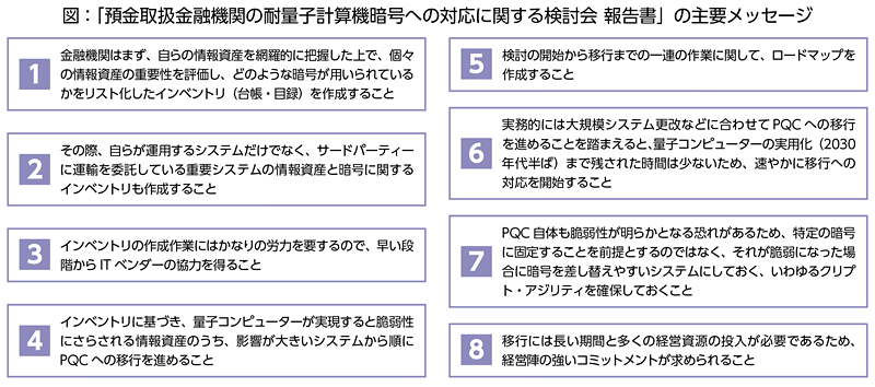 これらのメッセージとともに、「量子コンピュータの実用化によって現在の暗号技術が破られることになれば、インターネットバンキングをはじめとする金融情報システムの安全性が根底から覆される」といった強いメッセージを添えて、金融機関に対応を促している。