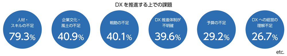 DXを推進する上での課題についても調査を行っている。2024年度調査では、これまで設問の回答選択肢に挙げられていた「人材・スキルの不足」「DXを受け入れる企業文化・風土の不足」「戦略の不足」「DX推進体制が不明確」「予算の不足」「DXに対する経営の理解不足」「その他」に加えて、「レガシーシステムの存在」「個人情報などセキュリティ上の懸念」「法制度やコンプライアンス対策」が新たに追加された。