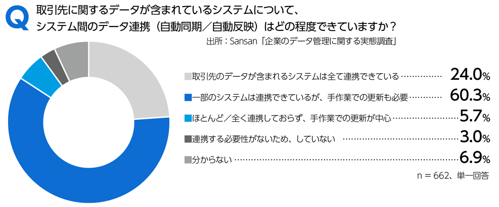 特に、取引先データを扱うシステム間の連携状況を尋ねたところ、「一部のシステムは連携できているが手作業の更新も必要」「ほとんど/全く連携しておらず手作業が中心」と回答した企業が66%に達した。つまり、約7割が「システム間のデータ連携は限定的で、手作業の更新が発生している」と感じていることになる。手作業による更新はミスを誘発し、データの不整合をさらに拡大させる。