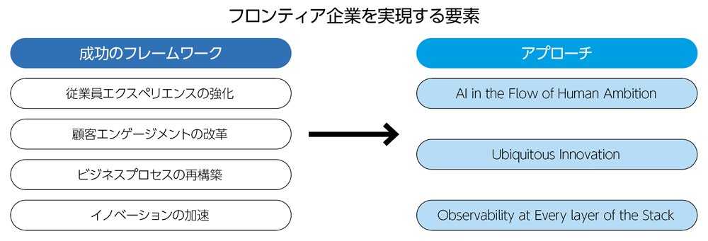 フロンティア企業を実現する要素としては、「従業員のエクスペリエンスの強化」「顧客エンゲージメントの改革」「ビジネスプロセスの再構築」「イノベーションの加速」という四つの成功のフレームワークを提唱しています。今回のIgniteでは、このフレームワークを実現するためにマイクロソフトのAI戦略のビジョンである三つのアプローチを説明しました。