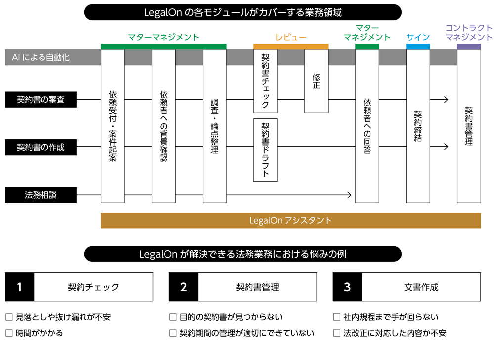 法務業務は専門的な知識を要するため、一人法務といった担当者不足に悩む企業が多い。また、そもそも法務担当が社内に存在せず、総務や経理が法務を兼務するケースも少なくない。このような場合、法務の専門知識を持たない担当者が契約書を確認することになるため、重要な条項やリスクが抜け落ちていないかという不安が常につきまとう。加えて、法務業務関連の情報が社内に分散し、必要な情報の検索に大幅な時間を費やしてしまう課題も存在する。こうした法務業務に関する悩みを包括的に解決するのが、LegalOn Technologiesが提供する法務AIプラットフォーム「LegalOn」だ。