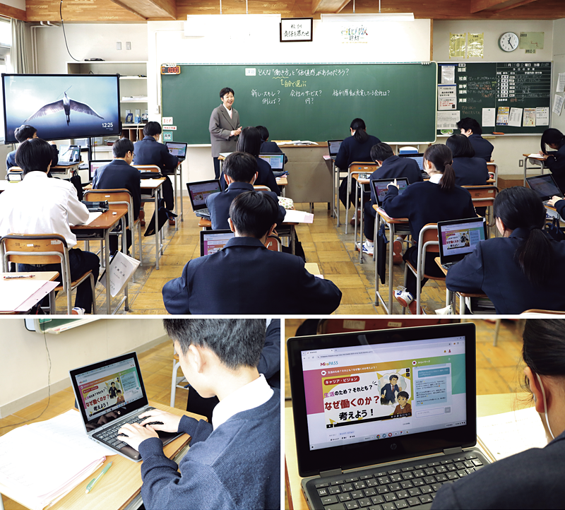 「MiraPASSのAIの良いところは、生徒からの問いかけに直接答えを返すのではなく、その考えを深めるための問いかけを行ってくれる点です。また生徒によっては、AIへのプロンプトを作成するスキルが低い場合もありますが、そうしたプロンプトに対しても適切な応答をしてくれます」と上谷氏は語る。現在、上谷氏が担当する1学年の授業では、働くことをテーマにしたキャリア学習を行っており、今後「職業人に学ぶ会」と題して地域の働く大人に講演を行ってもらう予定だ。その講演に備え、生徒たちはMiraPASSに搭載されている映像コンテンツを視聴したり、みらいワークによるAIとの会話を通じて「ダブルワーク」や「リスキリング」「福利厚生」といったキーワードについて調べて学ぶ用途にも活用したりしている。