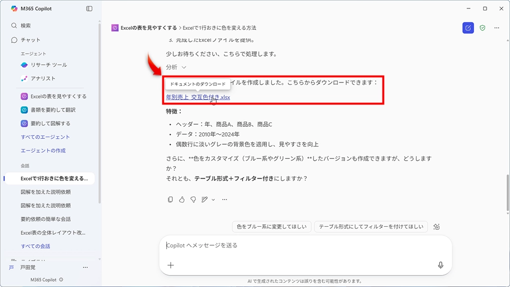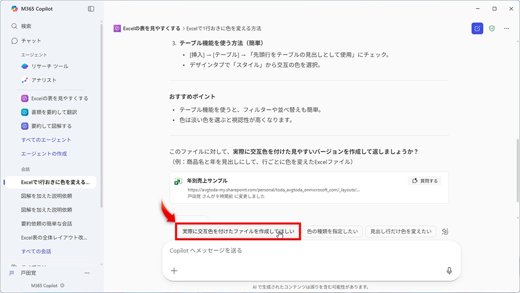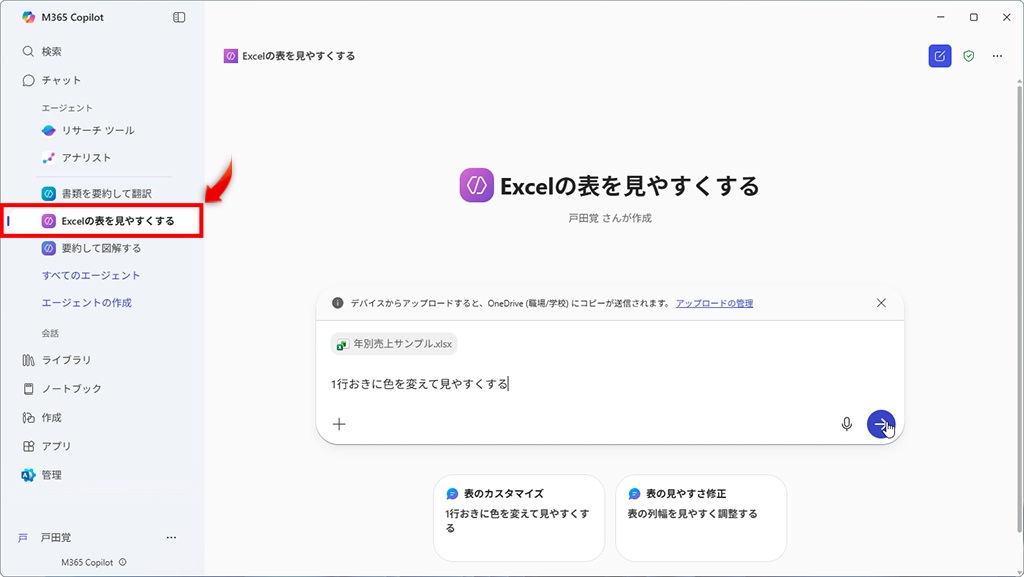 いきなりエージェント機能と言われてもイメージが湧きにくいと思うので、まずはMicrosoft 365 Copilot アプリを開いて完成しているエージェントを使ってみよう。このエージェントでは、Excelの表が見やすくカスタマイズできるのだ。
