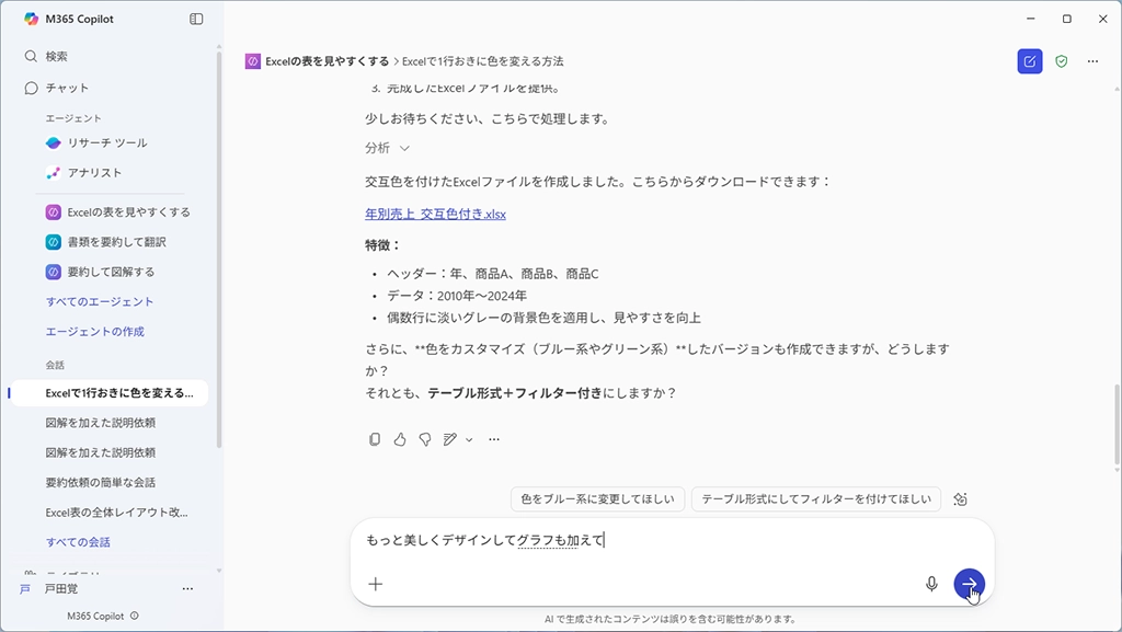 エージェント機能では、普通のAIのように追加で作業を依頼できる。できあがってきた表がイマイチぱっとしないのだが、色を変えたりテーブル+フィルターなどを提案してきた。そこで、「もっと美しくデザインしてグラフも加えて」というプロンプトを入力して調整した。