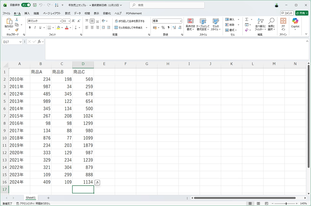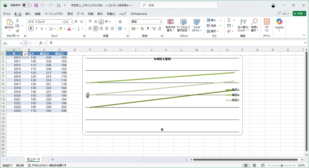 その結果できあがった表が以下だ。一度完成したグラフが気に入らないので、さらにアドバイスに従って複合グラフにしてもらった。やり方さえわかれば、こんな作業が2~3分でできるのだから舌を巻くばかりだ。
