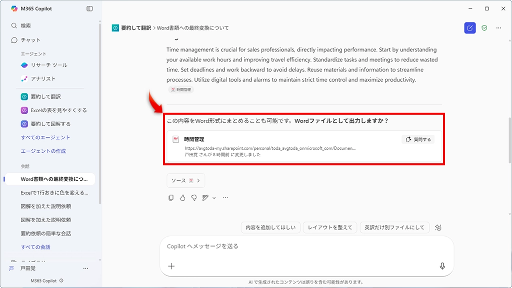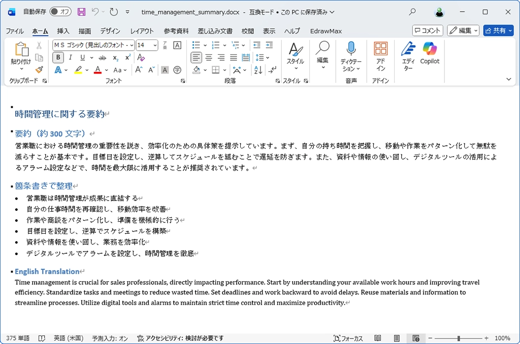最終的にはWordのファイルを書き出すことができ、それなりにレイアウトもされている。翻訳まで一発でしてくれるのは、Copilot以前を考えると夢のような便利さだ。