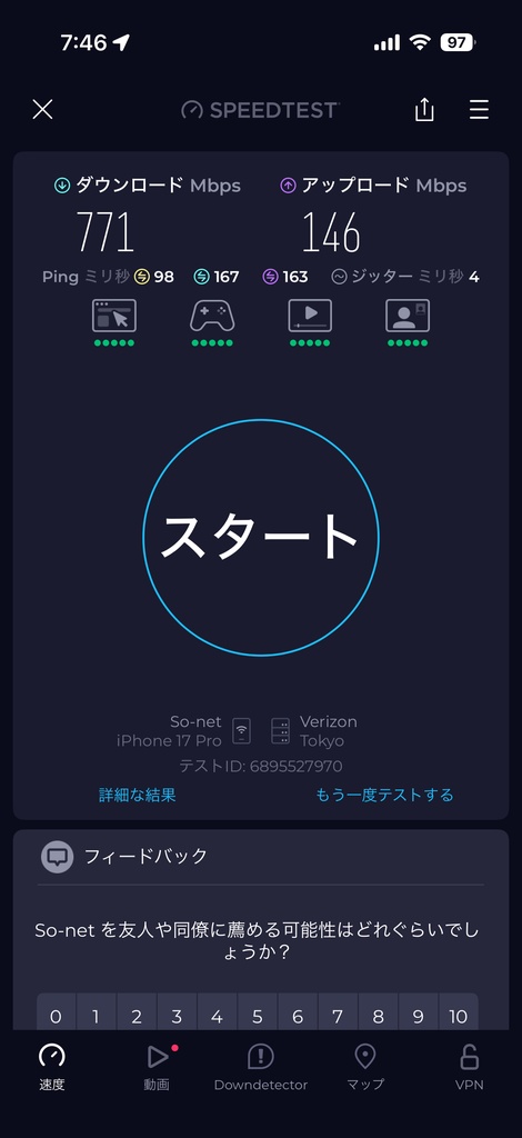 一方、インターネット回線を経由するSpeedtest.netでは、下り771Mbps、上り146Mbpsという結果になりました。iPerf3より数値が下がっているのは、ローカルネットワーク内で完結しておらず、プロバイダー網や経路上の混雑、サーバー性能など、さまざまな要因が影響しているためです。