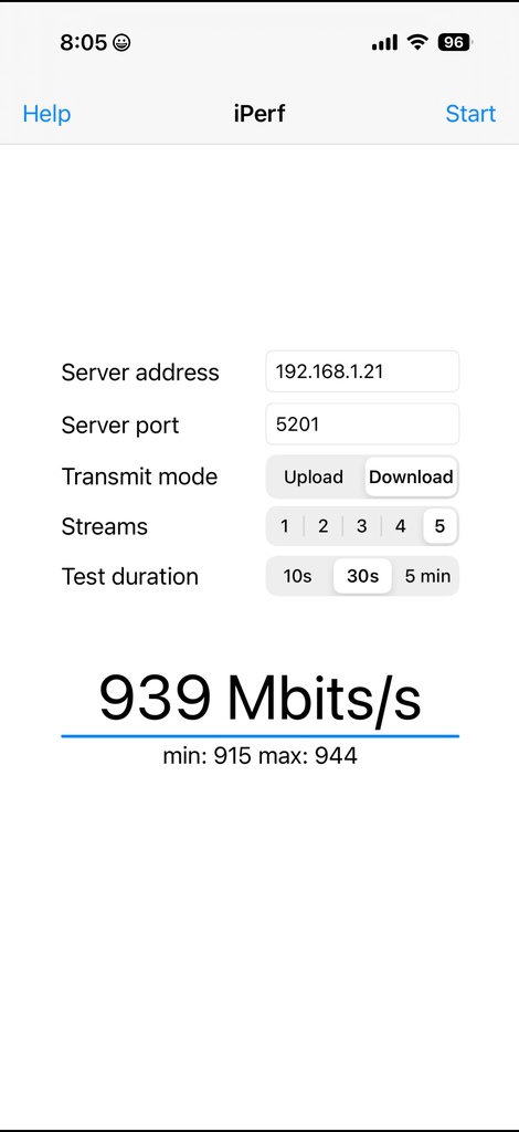 それでは「WSR-6500BE6P」がどのぐらいのパフォーマンスを備えているか見てみましょう。まずはローカルネットワーク内で、iPerf3を用いて速度計測しました。Wi-Fi 7対応ルーター「WSR-6500BE6P」と「iPhone 17 Pro」の組み合わせでiPerf3による通信を実行したところ、下り939Mbps(最小915Mbps、最大944Mbps)という通信速度を記録しました。