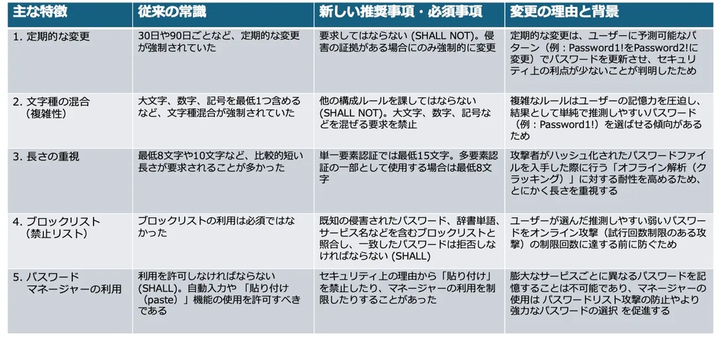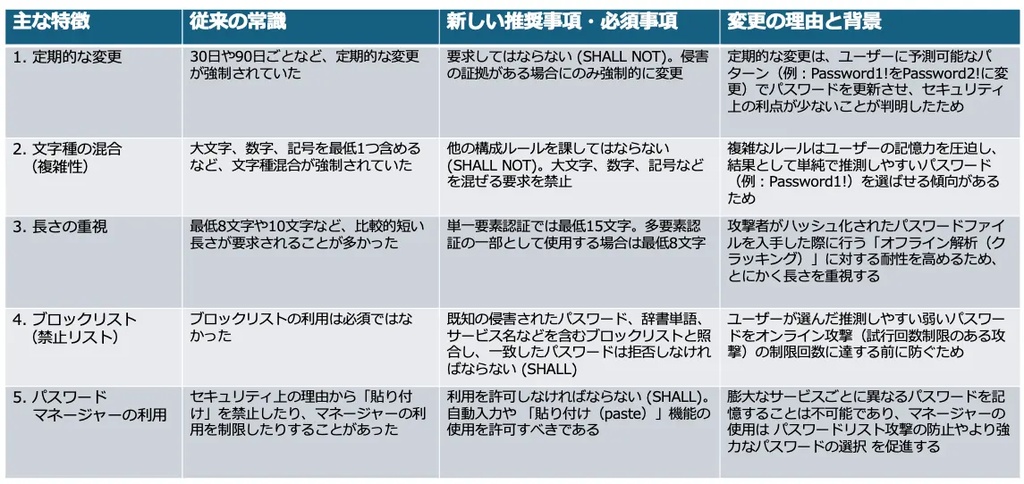 - 2018年頃から、文字種の複雑さよりも長さや使い回し防止を重視する記述に