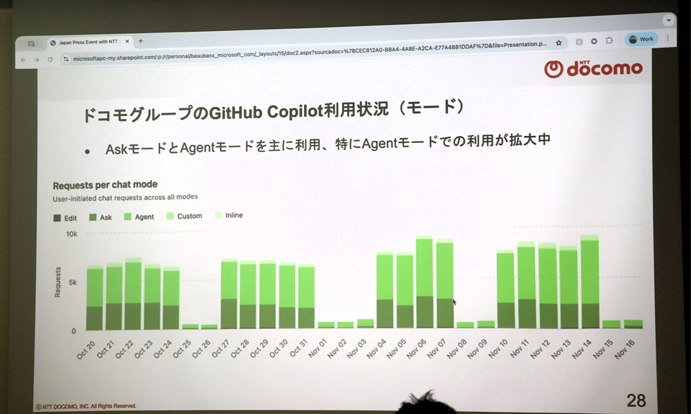 NTTドコモグループではGitHub Copilotも積極的に活用されている。前述した3,647名の利用者の内、毎日1,000名ほどのユーザーがアクティブに活用している。GitHub Copilotには『Askモード』と『Agentモード』が用意されているが、NTTドコモグループで特に利用されているのは自然言語による指示で開発タスクを自律的に実行するという、後者のAgentモードだ。