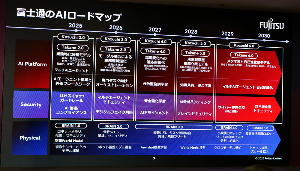またAIを支えるコンピューティング分野では同社が開発しているArmベースの次世代プロセッサー「FUJITSU-MONAKA」に触れ、144個のデュアルソケットCPUになることや、国産CPUであることの強みが語られた。2026年のテープアウトを予定している。またスーパーコンピューター「富岳」の次世代となる「富岳NEXT」(開発コードネーム)に搭載予定のFUJITSU-MONAKA-Xに採用される技術のほか、同社の量子技術、ネットワークなど広範な技術についてのロードマップが語られた。