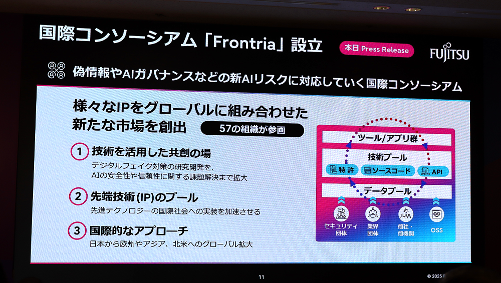 また説明会当日に設立が発表されたのが、国際コンソーシアム「Frontria」だ。これは生成AIが急速に進化したことによって、偽情報や誤情報が拡散されていたり、AIシステムに脆弱性が生じていたり、法規制への準拠が必要になったりといった新たな課題が生まれている。これらの課題やリスクに対して包括的なアプローチで対応するために作られたのがFrontriaだ。