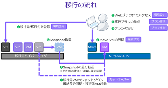ここでは、Moveを利用した移行の流れを①〜⑧の手順に沿って説明します。