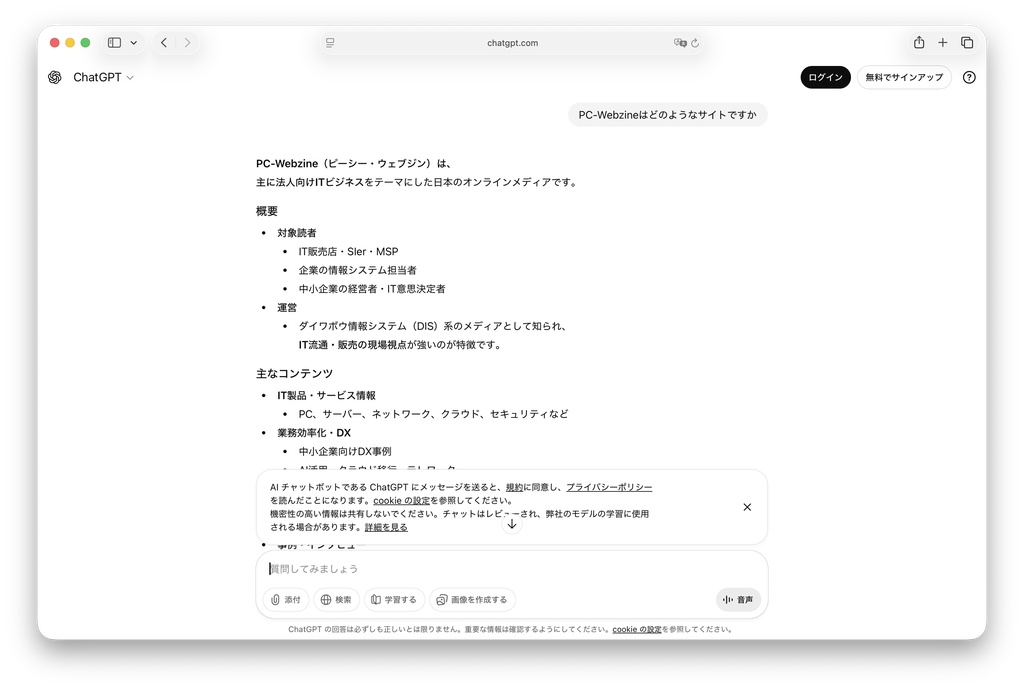 ところが、生成AIでは「PC-Webzineはどのようなサイトですか」と自然言語で入力して検索すれば、PC-Webzineのサイト全体を評価して、要約して紹介してくれます。